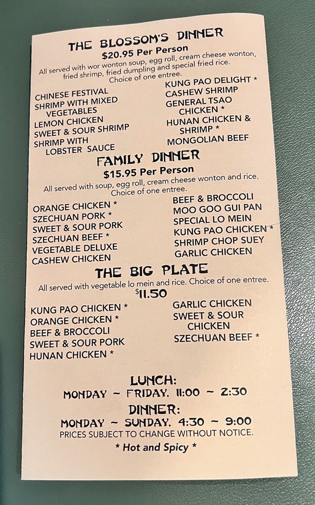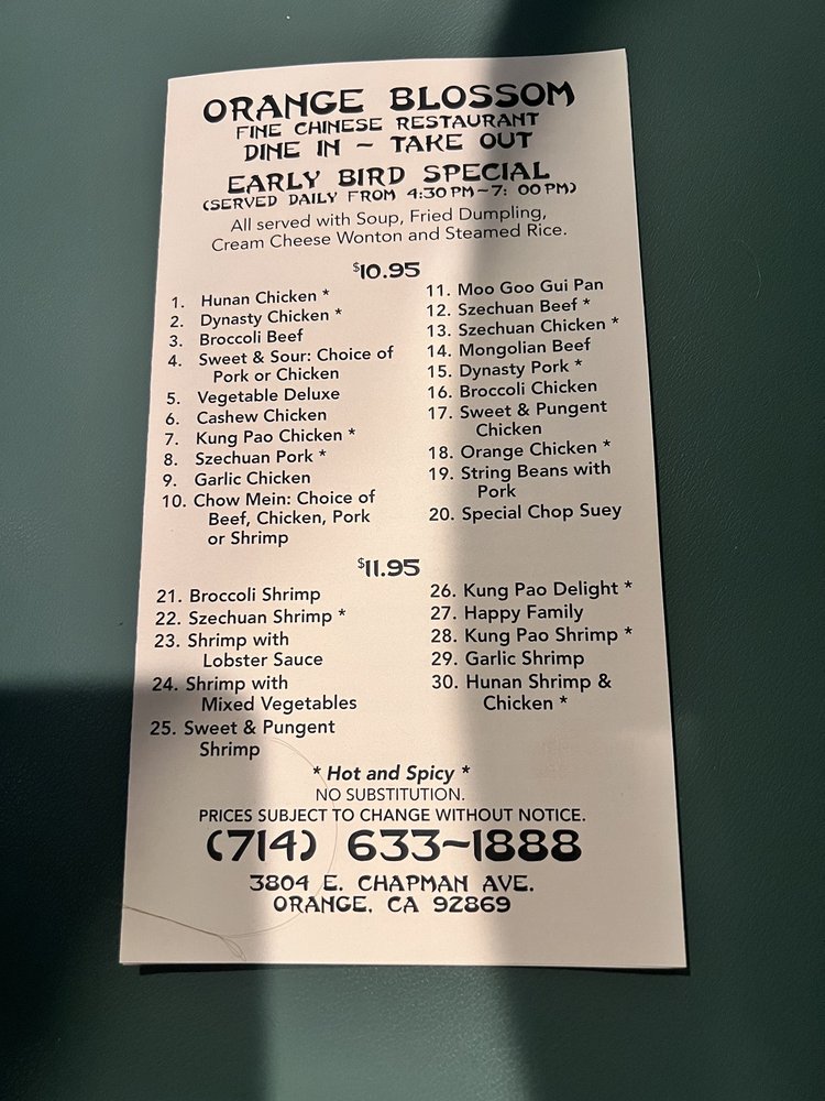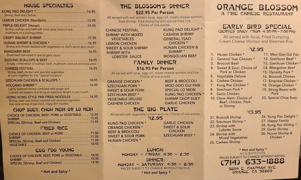 Orange Blossom Chinese in Orange, CA, offers a wide range of Chinese dishes with a focus on quality and flavor. The restaurant provides a variety of utilities such as reservation options, takeout, delivery, and catering services. Customers rave about their favorites like chicken chop suey, Mongolian beef, and sweet-and-sour pork. The menu also includes a variety of specials and affordable prices, making it a popular choice for families and groups. The friendly service and fresh, flavorful dishes stand out, with options like orange chicken and vegetable fried rice receiving high praise. Overall, Orange Blossom Chinese is a must-visit for those craving delicious Chinese cuisine in a casual and welcoming setting.